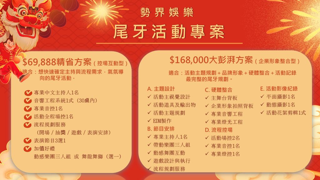 勢界娛樂以多年企業活動經驗,打造最適合中小企業與品牌團隊的高效整合方案。8萬起即可搞定主持與互動,15萬方案更包含視覺與影音,讓每一次尾牙都成為團隊記憶裡的重要片段。
