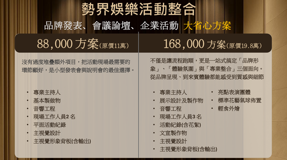 當你釐清了活動型態、掌握基本流程後,下一步,就是選擇一個合適的執行方案。勢界提供兩種實用組合,能因應不同規模與預算需求,協助你穩妥落地每一場活動。